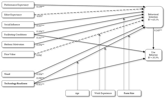 First, the farmers’ technology readiness has both the strongest influence on their intention to use smart products (0.280) and on their use behavior (0.321), which makes it the strongest determinant of smart product use. If a farmer features the technological readiness, the adoption of smart products becomes more probable. One of the few studies to examine technology readiness for IoT implementation on farms also emphasizes the importance of technology readiness for adoption [57]. The present study identified a moderating effect of farm size on technology readiness, such that it exerts a greater influence on smart products behavioral intention for large-scale farms of 140 hectares or more. Other studies have already demonstrated that the adoption of smart farming technologies is positively correlated with farm size [19,21,27]. Furthermore, technology readiness is moderated by the farmer’s work experience; thus, the influence of technology readiness is stronger for farmers with less than 30 years compared to farmers with more than 30 years of work experience. A moderating effect on the relationship between technology readiness and behavioral intention was also identified for age, which is higher for farmers up to 30 years of age than for those over 30. The results are also consistent with previous research findings regarding technology adoption on farms [101,102].