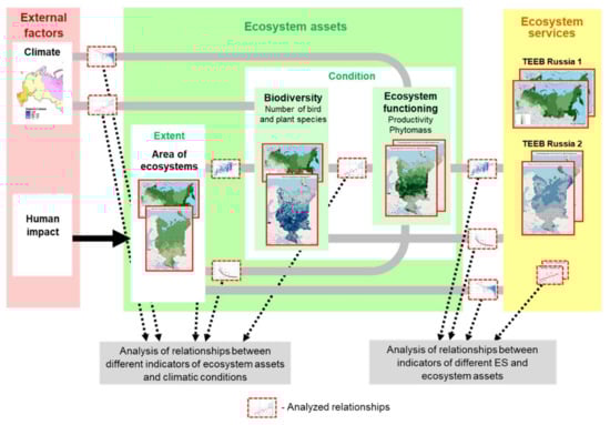 However, ES accounting is not sufficient to secure sustainability of ecosystems. It is also necessary to evaluate and incorporate ecosystem assets, i.e., ecosystems and biodiversity producing ES, as suggested by the concepts of TEEB and SEEA-EA. Therefore, the second project phase (TEEB-Russia 2, 2018–2019) aimed to find ways of implementing SEEA-EA in Russia at the national level. The main tasks were to analyze currently available data to assess the country’s ecosystem assets and ES as well as to determine the basic principles of their interpretation for decision-making. The analytical part of the TEEB-Russia 2 project specified indicators of ecosystem assets, ES, and external drivers (climatic conditions and the anthropogenic transformation of land). Further, the relationships between these indicators were analyzed (Figure 1). Thus, the TEEB-Russia project, despite the preliminary methodological focus, analyzed the relationships between the main groups of indicators, including those between biodiversity and ES, which are rarely considered in national assessments []. As is shown below, the results of this analysis can be useful in determining the general structure of national ecosystem accounting in Russia. The main results of TEEB-Russia 2 are published in Volume 2 of the Prototype National Reports on the Ecosystem Services of Russia [].