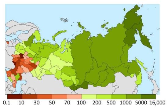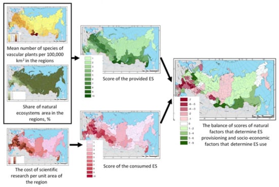 In view of the extreme diversity of natural and socioeconomic conditions within Russia, it is necessary to assess separately the potential ES in a particular region and the level of ES required and used by local people and economies. The most common pattern in Russia is an inverse relationship between the area of natural ecosystems that provide ES and the population density of consumers of ES (population and businesses), since economic activity generally leads to a reduction in the area of natural ecosystems []. Thus, the Prototype National Report suggests evaluating the following three ES volumes: