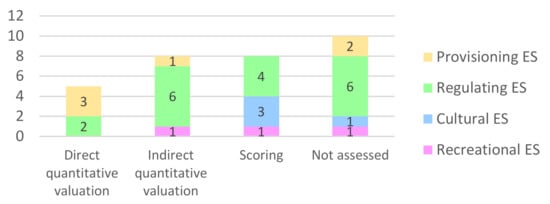 Currently, therefore, provisioning ES are most amenable to direct statistical evaluation. Indirect quantification was mainly undertaken for regulating ES services. Cultural ES were largely scored, and the majority of unassessed ES were regulating services (Figure 3).