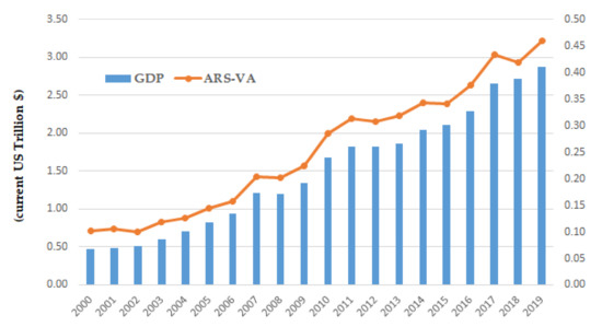 Trends of India’s GDP and ARS-VA from 2000–2019.