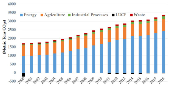 Agriculture is the main engine for economic development and feeding the world’s population in many countries. According to the World Bank, 65% of working poor adults made their living from agriculture in 2016 [1]. In the Indian economy, agriculture contributes to about 20% of the national gross domestic product (GDP), while about 58% of the Indian population depends on agriculture for their livelihood, directly or indirectly [2,3]. Figure 1 shows the trend of India’s GDP coupling with agriculture and its related sector value-added (ARS-VA) from 2000 to 2019 [4,5]. From Figure 1, it can be seen that there is a significant coupling relationship between GDP and ARS-VA in India. When there is an increase in the growth of Indian GDP, there is also an increase in the number of ARS-VAs, which indicates that the agriculture sector plays an important role in boosting Indian GDP. However, even though there is a direct relationship between India’s GDP and ARS-VA, the agriculture sectors are also known as major emitters of greenhouse gases (GHGs) into the atmosphere after the energy sectors. Figure 2 shows GHG emissions by sector in India from 2000 until 2018 (in Million Ton) [6]. It shows that after the energy sectors, the agricultural sector is the second-largest emitter of GHGs in 2018, with 22.63% (including Land-Use Change and Forestry), implying that the agricultural sector should also be a major target in the GHG emission abatement. India is also the third-largest emitter of GHGs after China and the United States, and thus, Indian agriculture is exposed to stresses resulting from climate change due to emissions from agriculture and its related sectors. The increasing use of agricultural inputs (such as large amounts of energy consumption in the form of electricity, machinery, diesel fuel, fertilizers, human labor, etc.) used in agricultural production is the main driver of increasing GHG emissions in developing countries like India. Hence, we can say that the agricultural sectors also play a major role in the degradation of the Indian environment.