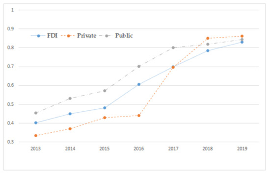 To find out the effect of a paradigm shift on the regulatory policies, we need to analyze the environmental efficiency trend of each group. Figure 3 shows the trend of environmental efficiency of Indian agriculture and its related firms (FDI, private, and public) during 2013–2019. The three groups started from the lowest efficiency value in 2013 and achieved the highest average efficiency in 2019. This steady increasing trend strongly supports the Porter hypothesis since regulation leads to increased performance throughout all the FDI, private, and public firms. With regard to respective group performance, it is notable that the private firms group shows very rapidly increasing environmental efficiency. This group showed lower than FDI and public in 2013; however, it finally surpassed them after 2018. The reason could be due to the demonetization of the banknote in India in 2016. Banknotes account for 86% of the country’s circulating cash, but their effects were only felt for its fiscal year in 2016. Transactions in the Indian agricultural sector (especially private firms) are heavily dependent on liquidity, which, in turn, could have impacted the private firm group’s performance in terms of environmental efficiency in 2016 [38,39]. Since the private firms are the most sensitive to the financial measures, this result suggests that a more customized financial support for environmentally friendly agricultural firms will result in stronger performance on GHG emission abatement. Furthermore, in terms of GHG measurement guidelines and a national benchmarking system, Indian firms still face a lack of uniformity and lack of managerial innovation, although they recognize the benefits of sustainable firms’ practices, implying financial incentives by the government as one of the best market-oriented measures [36].