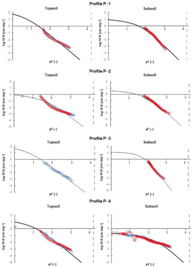 Water retention and hydraulic conductivity curves of samples were determined (Figure 2 and Figure 3) using HYPROP device. Soil hydraulic properties (SHPs) for the investigated locations were determined using the HYPROP-FIT program, as shown in Table 2. In previous studies, using HYPROP resulted in an equal or even more accurate estimation of the soil retention curve compared to the scarce data obtained by the traditional approach (sandbox and pressure extractor) [2]. The amount of water in the soil under fully saturated conditions (θs) in the study area (Table 2) varied from 0.422 (profile P−4) to 0.535 cm3 cm−3 (profile P−1). The variability of θs depended on the physical and chemical properties of the soil, and their coupling resulted in different water retention in the soil at different pressures. In our study, the repetitions used for the estimations of soil water retention curves (SWRC) showed similar values, which indicated the reliability of applied method. Figure 2 shows retention curves for locations P−1, P−2, P−3, and P−4, and Figure 3 shows the ratio of the relative amount of water in the soil and the hydraulic conductivity which are measured in the undisturbed soil samples. Blue and red circles represent the observation point of two undisturbed samples. In Figure 3, subsoil at the P−4 location shows errors at the beginning of the measurement (red circles), which can be a result of low Ks values thus affecting pressure differences. In the second set of measurements (blue circles), these errors were smaller and the measurement was more precise.