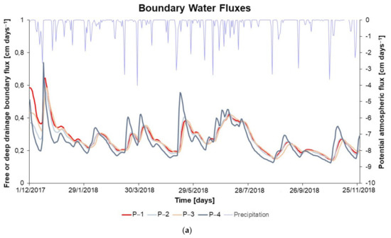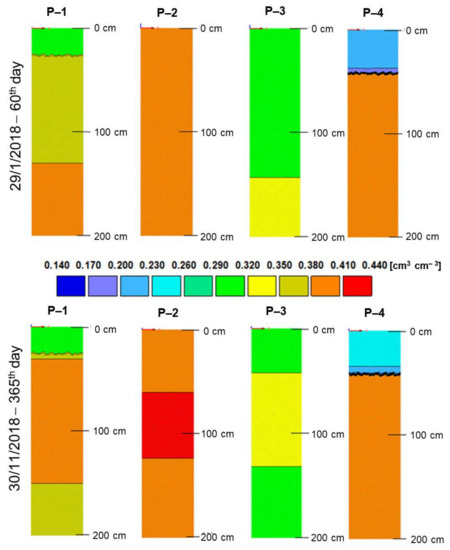The maximum water retention simulated inside the P−2 soil profile recorded on the last day of simulations (365th) possibly was result of high clay and Corg content, which have high adsorption capacity. However, climatic conditions (increased precipitation and low temperatures resulting in lower evapotranspiration), high content of silt, and low Ks values could have also contributed to the soil water retention. These results are in line with another study whose results showed that higher water retention and water content are results of high silt and clay content [82]. On the other hand, the lowest values of soil water content (topsoil layer at P−4) are possibly affected by the highest values of bulk density because of a negative correlation between water content and bulk density [64]. Higher water content in the subsoil at the same location could be a result of lower porosity since the compaction reduces total porosity and increases the volumetric water content [83]. Moderate water content at the P−3 location may be affected by the negative correlation between the water content and coarse sand and total sand [64].
