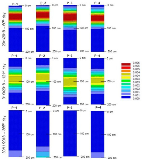 According to obtained results from HYPROP and HYPROP-FIT and especially the wide range of Ks values, we expected large differences in nitrate leaching at different locations and also the faster nitrate transport followed by the higher Ks values. After the soil annual water content was successfully simulated, the NO3− transport was modeled. Three days of the investigated year are presented, i.e., 60th, 121st, and 365th day (Figure 5). Nitrate concentration ranged from 0 to 5.68 × 10−3 mmol cm−3. For all three days for which the simulations are presented, the fastest nitrate transport was recorded at the P−3 location. As expected, the slowest nitrate transport for all simulated days was recorded at the P−2 location, which is influenced by the lowest Ks through the soil horizons compared to other investigated locations.