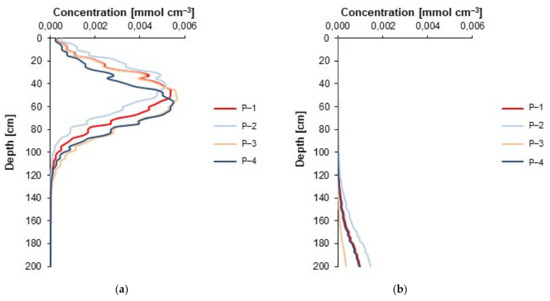 Nitrate concentration (mmol cm−3) and transport through soil solum on the 60th (a) and 365th (b) day at locations P−1 to P−4.