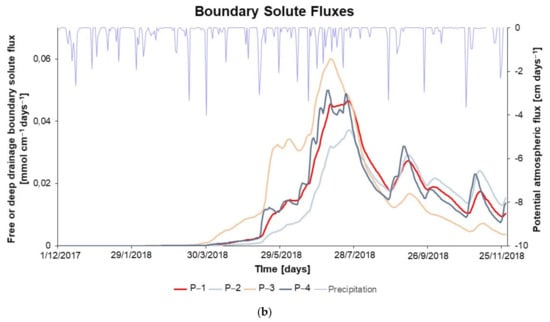 Simulations of boundary water (a) and solute (b) fluxes through time and precipitation intensity at locations P−1 to P−4.