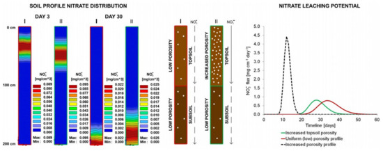 Modeling concept of nitrate (NO3−) leaching in soil profile with (I) increased topsoil layer porosity (increased Ks, α and n VGM properties values) and (II) uniform (low) porosity profile, identifying the buffering effect which directly influence nitrate leaching in soil. The porosity was treated as a factor which increase water flow and solute transport.