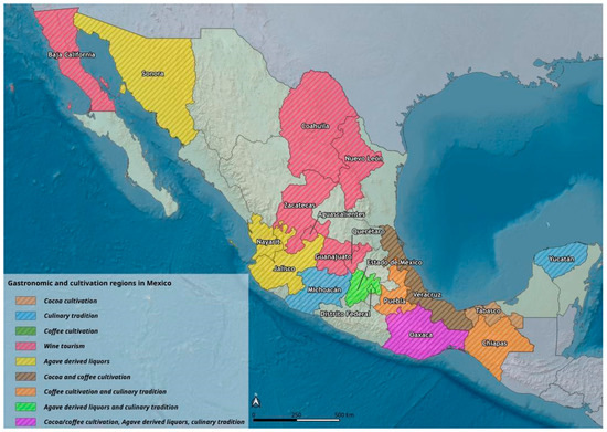 Figure 1 shows the gastronomic regions of Mexico in terms of communities and rural destinations where dishes and drinks receive tacit recognition in the international arena. The country’s culinary wealth is also based on plurality and cultural roots, which has resulted in it occupying a relevant place in the world gastronomic scene [48].