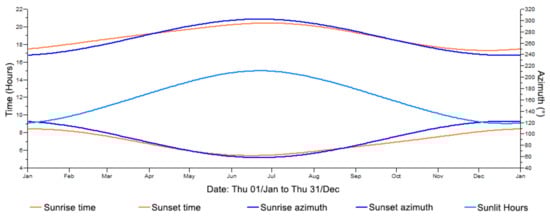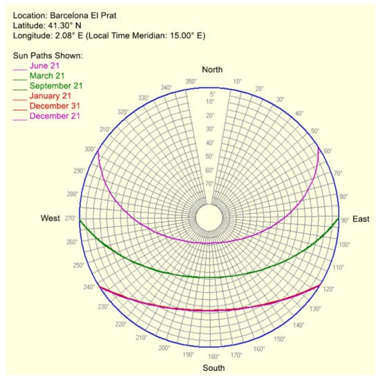 Figure 1 and Figure 2 depict the sun’s direction, angle, and number of hours of sunlight in Barcelona, Spain. For green façade implementation, accurate knowledge of sun paths throughout the year and climatic conditions is needed, as well as knowledge of orientation, landscaping, summer shading, solar collector area, and the cost-effective use of solar trackers.