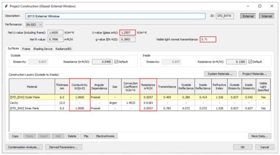 The main façade configuration in the simulation was composed of two layers of 6 mm glass with a 12 mm air layer in the middle filled with argon gas and a metal frame as the structure. The glazed façade specification is depicted in Figure 3.