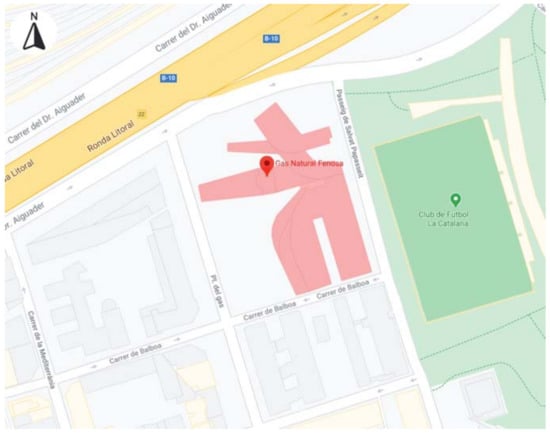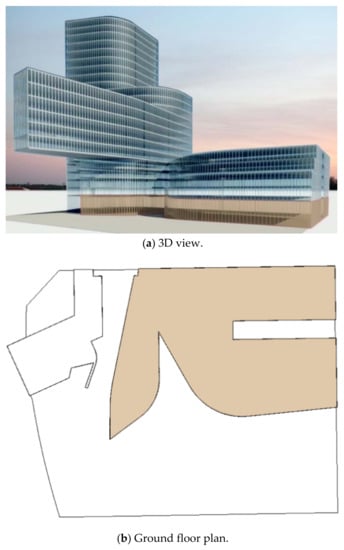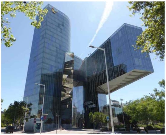This article’s case study model is the Gas Natural Fenosa Building in Barcelona, Spain, which is a high-rise office building. This building has two lower horizontal glazed blocks sticking out and cantilevered from the main tower, which has 22 floors and stands 86 m tall (Figure 4 and Figure 5) and was designed and constructed in 2007 by Enric Miralles and Benedetta Tagliabue.
