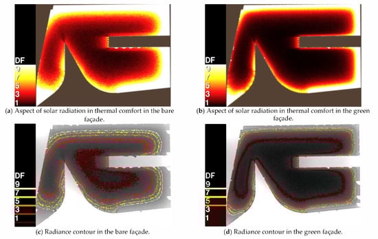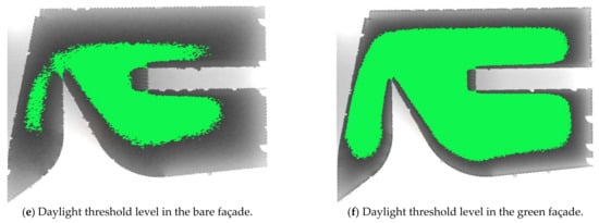 Figure 8 and Figure 9 perfectly illustrate the effect of daylight on thermal comfort with bare (glazed) and green façades. According to the values of the daylight factor in Figure 8 and Figure 9, the vegetation layer will shield the glazed façade from unwanted solar gains during hot summer days by as much as 50%. However, it should be noted that the use of artificial light is needed to protect the glazed façade via the vegetation layer.