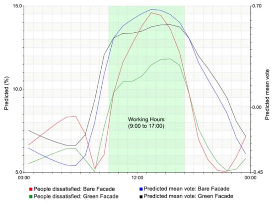 Another attribute to consider is the predicted percentage of dissatisfaction (PPD), which is a function of PMV [52]. Figure 10 and Figure 11 show the PMV value of both the bare and green façades, allowing for a comparison of the bare and green façades in terms of PMV and PPD. As a result, the PMV value of the green façade is similar to the ideal thermal comfort (0) of the bare façade (glazing façade). During working hours on 21 December and 21 June, PPD in the green façade is approximately 11.8% and 18%, respectively, but this value was increased by 14.6% and 26% in the bare façade; additionally, the PMV value in the green façade in both figures is closer to the ideal thermal comfort (0) than in the bare façade.