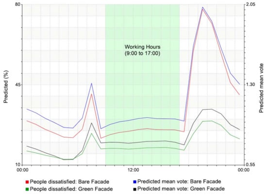 The aim of this study was to assess the thermal comfort efficiency of green façades in the Mediterranean climate by simulating and evaluating a pilot project developed in Barcelona using the IES VE software as a simulation tool. As the reduction in indoor temperature caused by a green layer is heavily affected by the building envelope layers, it is possible to infer that insulation content moderates the prevailing temperature differential between the inside and outside [35,39]. This study demonstrates how to use a green façade’s cooling ability to improve thermal comfort while lowering energy consumption.