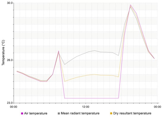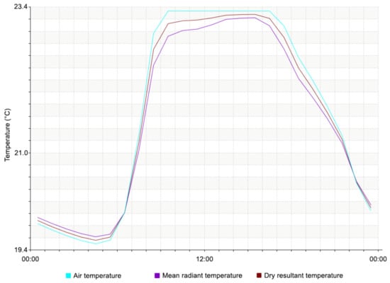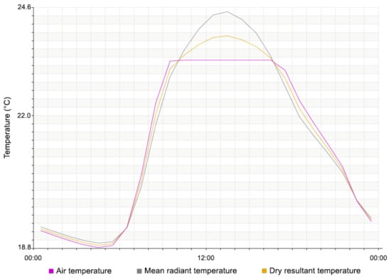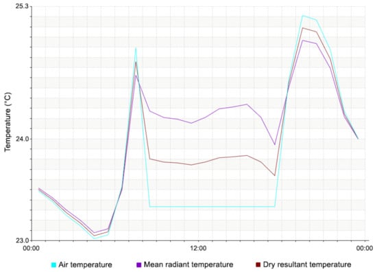 The radiant temperature can be determined using measured temperature values of the surrounding walls and surfaces, as well as their locations in relation to an individual [53]. Spaces with large areas of glass can exhibit greater differences between mean radiant temperature and air temperature. In winter, a cold surface can lead to cool radiant temperatures, and high solar gains can lead to high radiant temperatures since variations in outdoor temperature and solar radiation during the day affect the radiant temperature and therefore the thermal comfort [54].