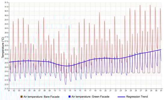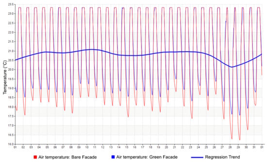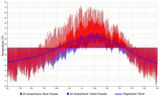 Figure 16 and Figure 17 show that the difference between the minimum and maximum indoor air temperature during December (winter) in the bare façade is approximately 7 °C; however, this difference is approximately 6 °C in the green façade. In June (summer), this disparity is approximately 9 °C in the bare façade and just 4 °C in the green façade. These values indicate that the indoor air temperature in the green façade is almost the same during the summer (Table 2), meaning that the indoor temperature is optimal and comfortable, allowing air conditioner usage to be reduced, resulting in lower energy use. Furthermore, the difference in air temperature between bare and green façades over a year (Figure 18) demonstrated how much greenery could influence indoor air temperature, thus improving thermal comfort.