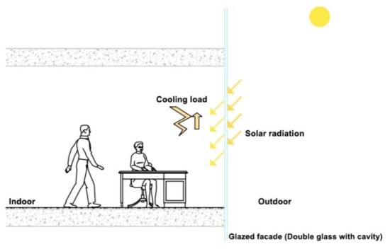 Glazed surfaces may have a major effect on occupants’ thermal comfort for two reasons: their transparency enables solar radiation to enter the space and increase the glazed façade’s inner surface temperature, and the temperature might differ greatly from temperatures of other surfaces, inducing long-wave radiant heat exchange and convective heat transfer to the adjacent space [38].