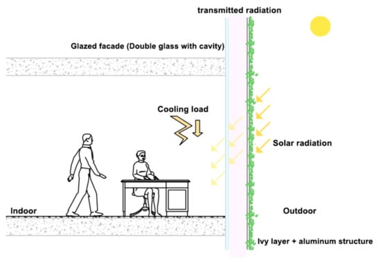 Section drawing to better understand the effect of solar radiation on indoor cooling load in the green façade. © By authors.