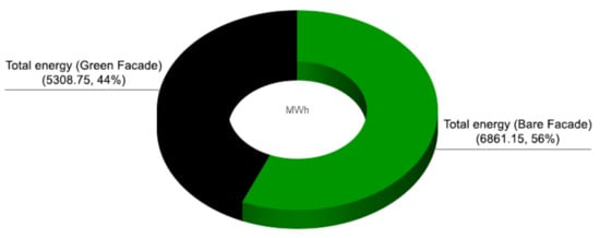 With vertical greenery systems, the potential energy saving for air conditioning in Mediterranean areas can be up to 40–60% [25,31,32,33,34,35]. According to research, green façades can save 1.30, 0.84, and 0.71 kW/h of energy per day for an 8.22 m2 flat on sunny, cloudy, and rainy days in summer, respectively, and can save up to 16% of the electricity consumption for air conditioning in July, August, and September, which are the hottest months of the year [36].