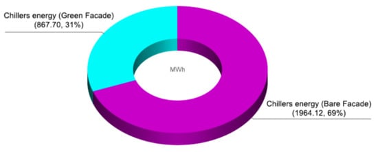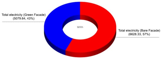 The building’s glazed façade naturally connects the interior with the environment and creates a sense of openness and space and provides light, but when designing a building with a glazed façade, the weather conditions must be considered, and due to Barcelona’s weather conditions, the building’s façades face about 15 hours of solar radiation during the summer and about 10 hours of solar radiation during the winter. Winter in Barcelona is mild and brief, and the majority of the year is hot. The building’s actions will change if a shading layer, such as a green façade, is applied. According to simulation findings, the green façade protected the building façade from extreme solar radiation, resulting in a lower indoor air temperature, radiant temperature, and PMV, as well as lower total energy usage (Figure 21), chiller energy (Figure 22), and total electricity (Figure 23).