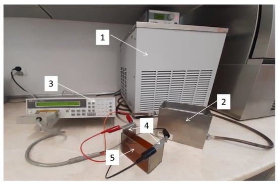 A set of devices of the measurement system used for electrical conductivity examination of the apple juice concentrate: 1—thermostat, 2—water jacket; 3—LCR device, type HP 4263B, 4—measuring glass cell with plate electrodes, 5—examined juice.