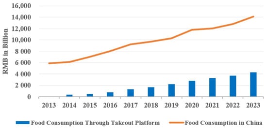 China’s online takeout industry has maintained a rapid growth trend since 2011. Food and beverage consumption of takeout platforms occupies a large proportion of the market share in China’s food and beverage consumption. With the rapid development of Internet technology, it is expected that by 2023, the consumption of takeout catering platforms will continue to grow (Figure 1). According to the expected growth trend, the online takeout business is likely to change from the former auxiliary catering mode to a major catering mode. In order to complete the sustainable development of the ecological environment, this growth trend will bring researchers to implement in-depth thinking and exploration of effective measures in the field of environmental protection.