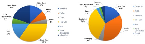 With the rapid growth of online takeout platforms, the percentage of online takeout business has reached about 14% in the overall catering industry in China and still continues to grow. Compared with the traditional catering mode, the online catering takeout mode has certain operational advantages, as shown in Figure 3. Although 35% of the cost comes from food materials, the cost of rent and labor cost account for a larger proportion of the cost structure of traditional catering. The cost of these two parts is basically the same as the cost of food, which reduced the profit margin to 5–10%. The online catering takeout mode, due to the greater reduction of in-person customers, its rent cost is only 3% of the total cost and the human cost is also reduced even to neglectable level, therefore the profit margin can reach up to 35%. For catering businesses, this change is enough to attract them to move from the traditional model to online sales or mainly online sales. However, the cost of packaging is increased in the online takeout catering mode. However, because the relevant regulations and guidelines do not clearly stipulate the use of packaging materials, most online platform businesses choose cheap non-degradable plastic packaging to reduce cost. Generally speaking, a takeout package of delivery contains plastic bowls, plastic bags, plastic spoons, plastic gloves, plastic soup cups and some paper packaging bags. These contents are actually the standard equipment of every takeout order. In other words, every takeout order will produce this kind of “white pollution” [24]. If we conservatively assume that the total number of orders for the three major takeout platforms is about 7 million per day, and each takeout has one plastic bag, which has a size of 0.06 square meters. Then, total daily plastic garbage from the three platforms could cover as much as 420,000 square meters, which is equivalent to the size of 60 standard football fields. Such garbage volume could cover the area of West Lake in Hangzhou in only 15 days. Therefore, it can be seen that there are serious problems of takeout garbage and white pollution in all cities of the country. The rapid growth of takeout has greatly aggravated the deterioration of related problems [25].