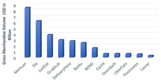 At present, three main food delivery providers in China are Meituan takeout, Baidu takeout and Eleme takeout, which account for more than 90% of the total takeout share in China’s domestic market according to the iMedia Consulting Database. These three major takeout platforms are developing from different marketing strategies to expand their user groups under the background of the gradually expanded user numbers. In recent years, these platforms form a tripartite situation in which the three major takeout companies jointly dominate the national takeout market will continue for a long time. Among them, the performance of the Meituan Platform is outstanding, ranking first in the global GMW (Gross Merchandise Volume) ranking in 2018–2019, as shown in Figure 4.