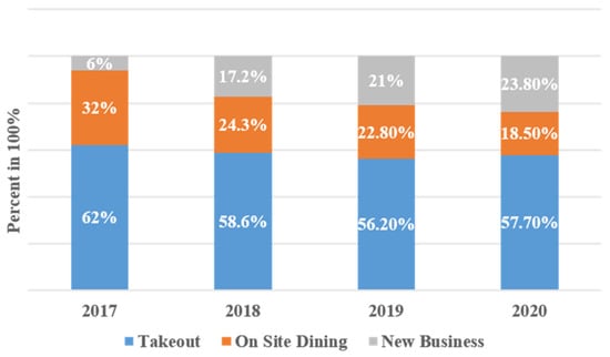 On the one hand, Meituan takeout has a flexible strategy to fit specific actual situations. Meituan Platform, working with many other businesses, launched some measures to help the major businesses to resume work under the epidemic. For example, during the epidemic, Meituan launched the “spring breeze” activities to provide different user subsidies, internet data red pockets for customers, and commission return plans for partners. This flexible and rapid response to the social environment has greatly increased the market share of Meituan after the epidemic and helps small or medium-sized businesses to resume work. To a certain extent, Meituan alleviated the economic impact of the epidemic on society. From 2017 to 2020, the proportion of delivery business revenue of the Meituan platform was 62%, 58%, 56.2%, and 57% respectively. The relatively stable revenue made this business become a pivotal business of the Meituan enterprise, and also became an important online catering platform for people who are studying and working at home during the epidemic period (as shown in Figure 6).