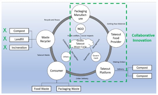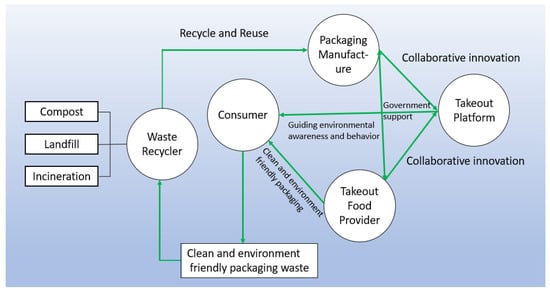 Hence, Meituan takeout has brought tremendous pressure to environmental protection. Since plastic tableware waste cannot be effectively treated, it may also cause a series of hazards, such as damage to human health, damage to the living space of animals and plants, and damage to the ecological balance of water and land. These realistic hidden dangers require us to pay attention to explore effective countermeasures to control the environmental pollution caused by online food delivery platforms. As shown in Figure 7, in the traditional takeout packaging waste cycle [38], the plastic waste of takeout catering is treated by composting, landfill and incineration, and according to common sense, these methods can solve the problem of plastic pollution. However, it is because that garbage is not strictly classified and most online merchants use low-cost non-degradable plastic packaging, the expected effect of composting is difficult to achieve. Additionally, the landfill and incineration of non-degradable plastics will pose a threat to the environment and health. If the traditional way continues, the impact of online takeout food packaging will be incalculable. Therefore, the collaborative innovation and research, and development of packaging materials, and promotion and use of innovative clean and environmentally friendly packaging can make this situation controlled to move in a better direction.