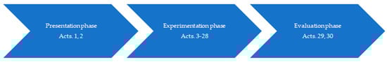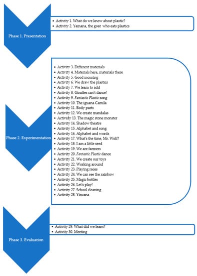 This project, especially aimed at children’s education, was intended to raise awareness about the excessive production and consumption of plastic. One of the best ways to collect information was to program and implement an educational proposal for education on sustainable development that would address the climate emergency and, particularly, the harmful effects of single-use plastics in Ghana. This proposal was carried out as a project with different phases (presentation, experimentation, and evaluation), as can be seen in Figure 1, and with a progressive design of around 30 activities, as can be seen in Figure 2.
