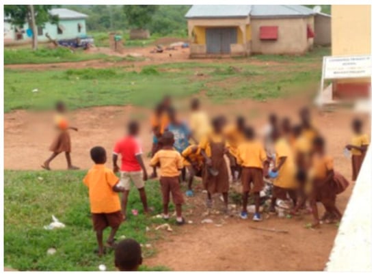 In a country whose rivers and seas are littered with plastic waste, only one child pointed out that plastic was not good for the environment, while the rest of their classmates saw it as a facilitator of their lives, not reflecting on its harmful effects on Ghana’s flora and fauna. Even though the Ghanaian curriculum includes the subject of environmental studies [22], it seems that the contents on the environmental consequences of plastic consumption had not been internalized. Figure 4 shows the sea of plastic that covers the surroundings of the Larabanga school.