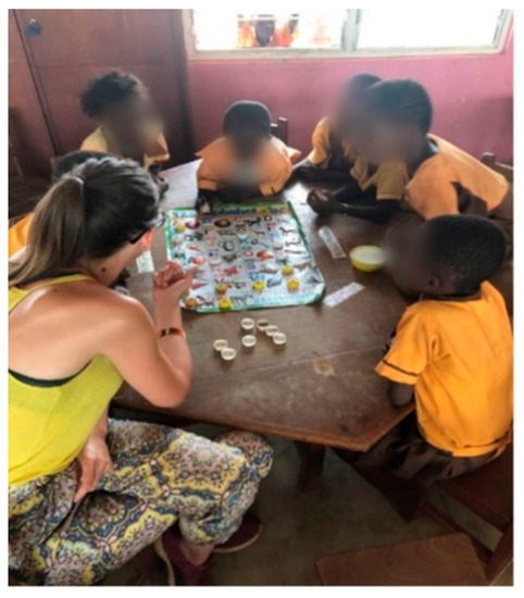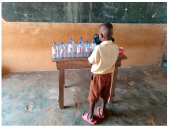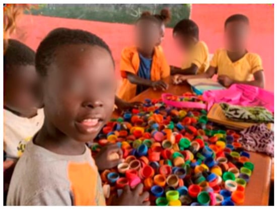 The prevailing methodology in the Ghanaian school system is based on the colonial system imposed by the British Empire [49]. It is fundamentally centred on discipline and authoritarian control of the classroom. Literacy and calculation are learned by rote, through repetition [50]. Nevertheless, Ghanaian education enjoys high social recognition as a tool for community development and social and labour insertion [51,52,53]. Plastic and its reuse became the base for learning other curricular content [54]. For example, in the activities “Numeracy” and “We learn to add” (see Figure 10), bottle caps were used for counting and learning addition, turning plastics into teaching material. The association of a number with the quantity of caps, and the possibility of counting and adding them in a manipulative way, helped the students learn to add up to ten in a simple, fast, playful way. Working in the classroom with waste materials, such as plastic caps, generated active learning where the children “learned by doing” and “experimenting” [55,56]. They also developed scientific and reflective attitudes about the reuse of this material [48,55,57]. The experience helped create experiential learning [58], far from the traditional Ghanaian mathematics learning experience, which is not very meaningful or comprehensive, but rather mechanical and repetitive.