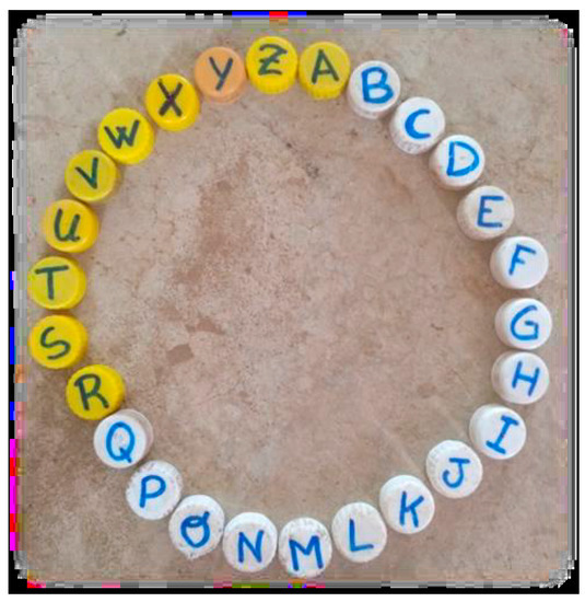 As stated above, in Ghana, the learning of mathematics prioritizes mechanization and rote learning. Working with recyclable materials makes it possible to rethink how to work with mathematical content using familiar objects, ubiquitous in the students’ daily lives. In this way, the use of recyclable materials in mathematical games brings the students closer to meaningful learning, since it favours reflection and analysis of specific situations related to the real world, providing context and motivation for learning [61]. Figure 13 shows the material used for one of the literacy activities. The alphabet was constructed using 26 bottle caps in different colours. The aim of this activity was to identify the letters, to associate the sound of the different letters with their graphic representation, to sing songs, and so on. Once this content was consolidated, the students were guided in the construction of new words (see Figure 14). In this way, they learned to write their name, the days of the week, the names of their parents, or the town in which they lived.