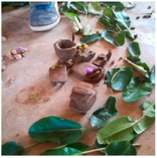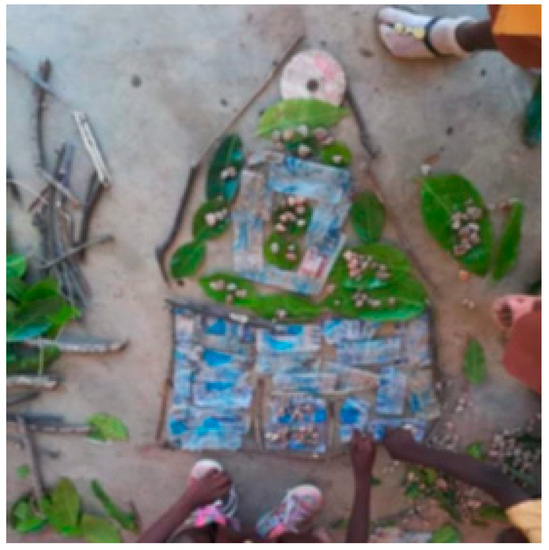 During the project, the children also worked on their art skills. They were asked to use plastic to make works where they could express their creativity and imagination. Artists and academics such as Lin Evola-Smidt, Michelle Reader, Ptolomeo Elrington, and El Anatsui, to mention a few, have used rubbish or waste materials to make works of art [48]. Many studies show that the creation of original and purposeful artworks from waste materials provides students with unique opportunities for the development of a rich and motivating learning environment, as well as critical and creative thinking [62] in creative and expressive visual arts experiences [63]. Likewise, the transformation of waste into appropriate learning materials for teaching art is considered a valuable contribution to an artistic reflection of people’s beauty and sensitivity [48]. Aesthetically, when working with material waste, the notion of waste is abandoned, and a new point of view and appreciation of waste materials emerges. When waste is transformed into something extraordinary, it remains within the aesthetic realm of producing teaching materials [64]. Furthermore, in this project, the waste materials were culturally appropriate to the students, given that they could easily relate to these materials because of their ubiquity in their immediate environment [65]. Thus, we developed the activity “We create mandalas”. In this activity, the children combined elements from nature with plastic waste to create artworks. As can be seen in Figure 17, one of the children represented his home using CDs and pii water bags. Another student preferred to use only natural elements because she no longer liked plastic, as can be seen in Figure 18. Waste paper, plastic, and cloth can be safely reused to create very useful and appropriate teaching materials that can serve as resources for art education [53]. As can be seen in the works of Ghanaian artist Serge Attukwei Clottey, real wonders can be achieved using plastic [66]. Improved manipulation skills, fine motor skills, and visual/spatial thinking skills have been shown to be predictive of success in scientific subjects [67].