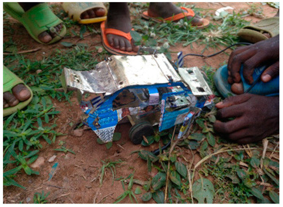 Given the improvement in motor skills shown by the children, this potential was used to encourage them to create toys by reusing plastic waste. In this regard, the pupils continued to develop their imagination and creativity with a playful purpose, and it was the teachers themselves who learned from them how to make balls, jump ropes, cars, and dolls from plastic waste. Many children claimed to use plastic almost daily to build their own toys. For example, they made footballs using pii water bags, and they used plastic bottle caps and soda cans to make cars like the one in Figure 21.