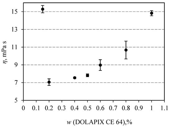 The dependence of viscosity on the concentration of Dolapix CE 64 for the investigated Al2O3 suspensions, pH value of all suspensions was 10.