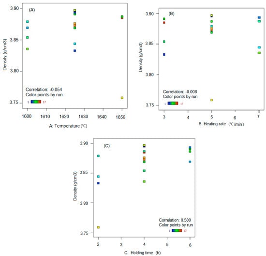 Linear correlation between Al2O3 ceramic density and: (A) sintering temperature, (B) heating rate, and (C) holding time.
