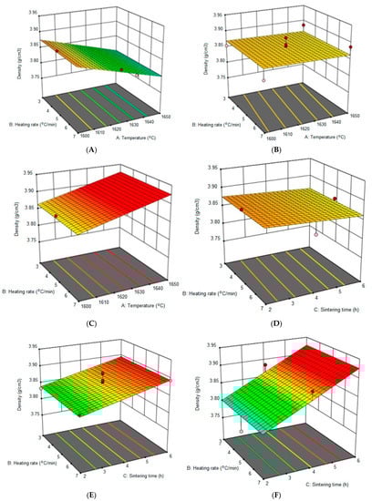 Figure 3 shows a 3D representation of the combined effect of all independent variables on the density of Al2O3 ceramics, with measured values from 17 runs. Figure 3A–C show the density dependence on the heating rate and sintering temperature at a constant sintering time in the duration of 2 h, 4 h and 6 h. The expected amount of Al2O3 ceramic density is almost independent of the heating rate when varying the heating rate and sintering temperature. The shape of the surface does not change with the change of the constant holding duration parameter, only the slope in space changes.