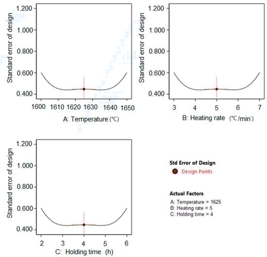 Experimental data from sintering processes are analyzed using various methods. One of these, response surface methodology (RSM), is used in this work, in combination with analysis of variance (ANOVA). RSM is a frequently used method for modelling. For example, Batista et al. modelled the combustion process of hydroxyapatite [], Khajelakzay et al. applied RSM to optimize the spark plasma sintering process for the fabrication of Si3N4-SiC/MgSiN2 [], Das et al. improved the tribological properties of glass-ceramics using RSM to model the output responses []. To determine the operational conditions for preparing magnesia partially stabilized zirconia refractory, Jiang et al. used RSM []. Arzani et al. used RSM based on the central composite design (CCD) to analyze operating parameters for the preparation of mullite ceramic microfilter membranes []. Kockal et al. used RSM to optimize the response of input variables to produce a ceramic tile with improved properties [].