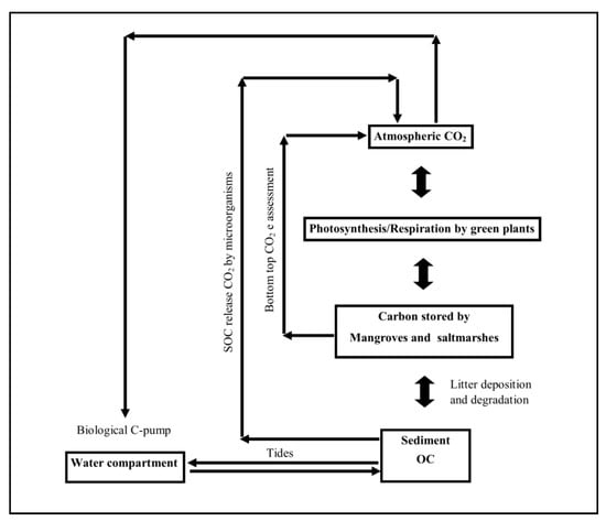 Carbon cycling refers to the absorption of carbon dioxide from the atmosphere and conversion to carbohydrates by salt marshes, mangroves, seagrasses, phytoplankton, algae, micro-organisms, and organisms with calcium carbonate covering. During outwelling, this carbon is washed off to the sea and through transformation, carbon fluxes are established (Figure 1). Mangroves and their associated vegetation help in trapping the upwelled waters adding nutrients to the sediment and to the adjoining waters [11]. Coastal sediments in the mangrove ecosystem account for 50% of carbon storage thereby playing a major role in carbon biogeochemical cycling [12].