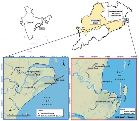 The western Bay of Bengal comprises two major mangrove chunks viz. Bhitarkanika Wildlife Sanctuary and the southern part of it, the Mahanadi mangroves. The two mangrove chunks are noted for their own characteristics, the former being a reserve forest area with dense mangroves and the other an anthropogenically disturbed zone with moderately dense vegetation. Both the areas are located in the Kendrapara district of Odisha and form the estuarine complex of River Mahanadi with the Bay of Bengal. The Bhitarkanika Wildlife Sanctuary located between the coordinates 20°40′ to 20°48′ N latitude and 86°45′ to 87°50′ E longitude covers an area of 0.0672 ha where 5 sampling sites (Stns. 1–5) namely Dangmal, Bhitarkanika, Gupti, Habalikhati, and Ekakula were selected. The Mahanadi estuarine complex covering 6651 ha is located between 20°18′ to 20°32′ N latitude and 86°41′ to 86°48′ E longitudes in Odisha where 5 stations (Stns. 1–5) were selected in the tidal creeks namely Jambu, Kansaridia, Kandarapatia, Kantilo, and Bhitar Kharnasi, respectively. The region experiences a hot and humid climate and is regularly flooded with tidal waters from the Bay of Bengal (Table 1 and Figure 2).