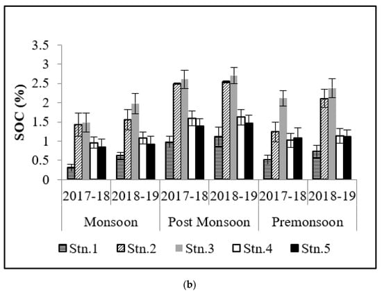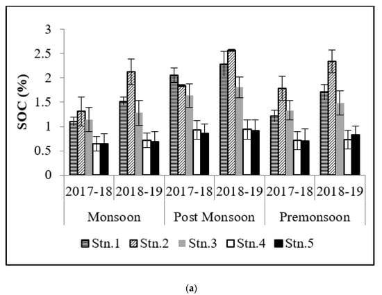 SOC contributes significantly to the carbon cycle as it plays a major role in the mineralization of hydrogen and carbon through microbes and also enriches the adjoining waters during outwelling. Hence, the density of vegetation and climate of the area both have significant roles to play [18]. The highest values of SOC in post-monsoon (2.71 ± 0.03%) is a reflection of the stored carbon after the monsoon precipitation (0.31 ± 0.04%) from the adjoining landmass (Figure 3). Over the last two years (2017–2018 and 2018–2019), it has been observed that SOC values are comparatively higher at Stns.1, 2, and 3 at Bhitarkanika and Stn.2 and 3 at Mahanadi mangrove ecosystem owing to the fact that these stations are areas with dense mangrove patches. ANOVA results have shown significant spatial and temporal variations that have also been reported by Reddy and Hariharan [19]. SOC values were lower in monsoon and higher in post-monsoon which may be attributed to the more microbial degradation (owing to the moist condition) of accumulated inorganic matter, which favors high organic matter in sediments [20]. The present study has indicated that high saline soils have a low potential for carbon storage which may be due to the poor growth of mangroves [21]. The dependence of carbon storage potential on soil quality has also been stated by Canadell et al. [22].