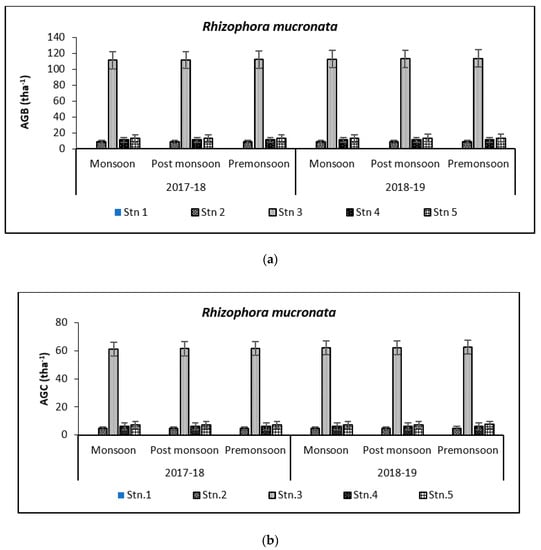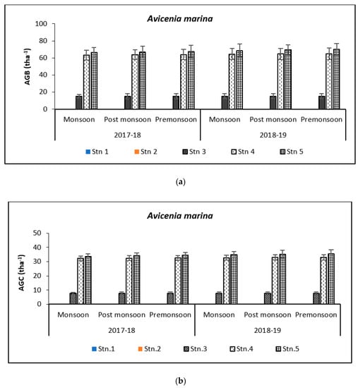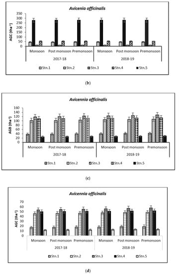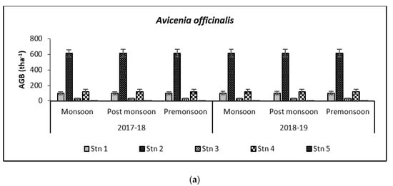 It has been reported that biomass values can be even more than 250 tha−1 [23] in forests with no anthropogenic interferences. Our results are comparable with that in the Sundarbans [24,25], Japan [26], Australia [27], Senegal [28], Guade–loupe [29], Puerto Rico [30], Thailand [31], Florida [32], the Indian Bay of Bengal [33], Indonesia [34], Malaysia [35], Sri Lanka [36], Andaman Islands [37], and Philippines [38]. In the present study, the diurnal inundation of tides was dominated by A. marina, R. mucronata, and E. agallocha because all the three species dominated in high saline areas of the selected stations.