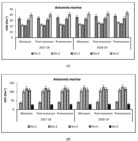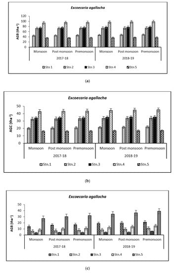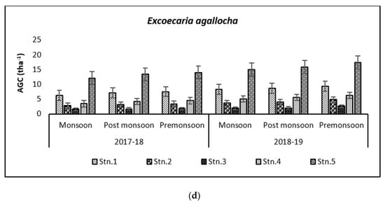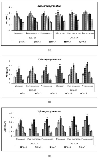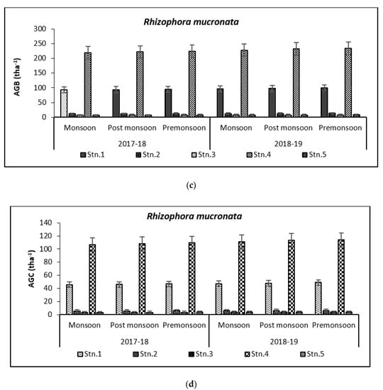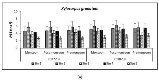 Above Ground Biomass values ranged from 0.64 ± 0.21 tha−1 for X. granatum to 616.94 ± 50.15 tha−1 for A. officinalis in the study area. Similarly, the Above Ground Carbon values also varied from 0.31 ± 0.10 tha−1 for X. granatum to 280.83 ± 21.29 tha−1 for A. offficinalis (Figure 4, Figure 5, Figure 6, Figure 7 and Figure 8). Spatial variation between the five species that were selected showed the highest value of AGB for A. officinalis at Bhitarkanika and R. mucronata at Mahanadi, while E. agallocha showed almost a uniform growth pattern. Comparing all the species and all the stations, the biomass per hectare of E. agallocha was the highest owing to its high adaptability. This has been proved by significant MANOVA values between stations (p < 0.05) although the variation was insignificant between seasons. Biomass contribution by stem varied from 42.51 ± 21.22% to 89.53 ± 4.30% branch from 9.91 ± 3.67% to 39.97 ± 20.69% and leaf contribution to 0.90 ± 0.47% to 7.65 ± 3.76% and stilt root contributed 29.52 ± 1.11% to 34.14 ± 16.10% (Table 2 and Table 3), respectively.