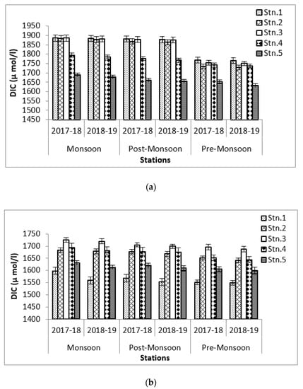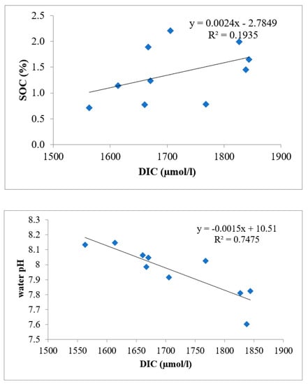 The present study shows that DIC values vary from 1632 ± 9.37 during premonsoon 2018–2019 at Stn.5 to 1887 ± 16.82 µmol/Lduring monsoon 2017–2018 at Stn.1 at Bhitarkanika and from 1549 ± 8.88 during premonsoon 2018–2019 at Stn.1 to 1632 ± 9.56 µmol/L during 2017–2018 at Stn.5 at Mahanadi (Figure 9). The data shows that increase in DIC is inversely proportional to the pH of seawater and positively proportional to SOC because of its dependency on seawater buffer capacity (Figure 10). The other facts on the change are due to the mixing and air-sea interaction through diffusion [45].