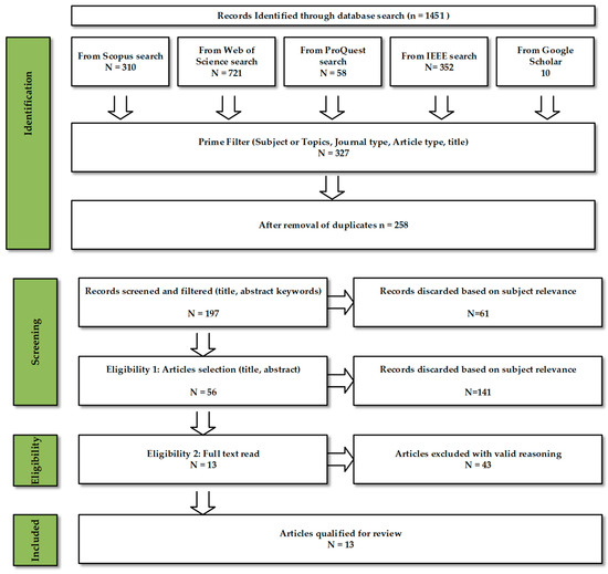 Four reliable trans-disciplinary databases—namely, Scopus, Web of Science, ProQuest and IEEE—were selected for this research. The year selection ranges from 2010 to 2020. A separate search was also conducted through Google and Google Scholar to generate results based on grey academic literature (e.g., reports and articles) that might be relevant and may not have been discovered if running only the usual academic database search. Since Google prioritises search results by number of citations, initial result pages were preferred. Publications were selected in accordance with their scope and the eligibility criteria (listed in Section 2.3), and emphasis was given to documents that contained reviews.