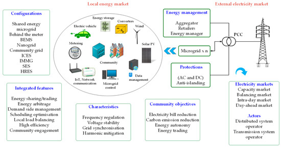 Content included reasons for different components and configurations used for microgrids in communities, their strengths and shortcomings, challenges (technical as well as regulatory), optimisation control methodologies and future recommendations. Microgrids for communities generally operate on AC-type DRESs with or without battery storage, with the main objective of obtaining low-carbon, cheap electricity and autonomy for consumers by facilitating energy sharing and trading. At the niche level, the process involves technologies used in microgrids for power conversion, control, protection, monitoring and grid interaction. From an administrative point of view, energy management considering load demand and grid connection is also vital, as is discussed below.